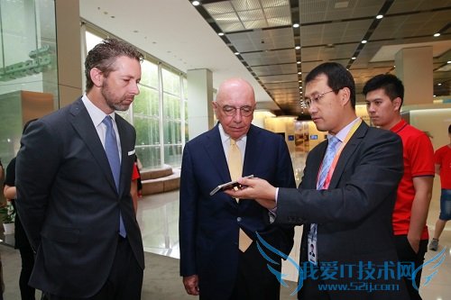 华为手机产品线总裁何刚(右一)向AC米兰俱乐部主席加利亚尼(右二)介绍华为P8手机