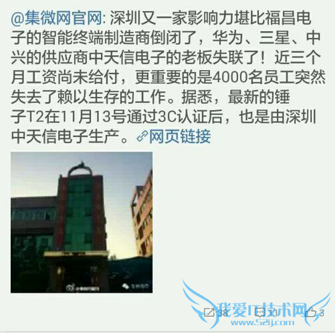 据悉,最新的锤子T2在11月13号通过3C认证后由深圳中天信电子生产。而集微网官方微博(@集微网官网)今日发布的消息称,在12月18日(周五)下午,中天信电子老板刘超强被传失联,拖欠员工3个月工资共近3000多万元。此外,中天信还欠下了巨额货款、民间借贷和银行贷款,以及300多家供货商的供货需求。当天,有一名员工精神失常闹着跳楼,武警出动维持现场秩序。