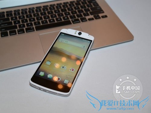 整体来看OPPO N1外形抢眼,高端大气,与众不同。N1延续了OPPO在Find 5上所使用的机身质感,5.9英寸的大屏手机还是比Find 5大出不少。虽然屏幕已接近6英寸,由于优秀的做工,它并没有给人“山寨”的感觉。手机背面材质为塑料,采用磨砂质感,白色机身非常亮眼,可是容易沾染污渍。磨砂材质增大了摩擦力,使手机握感非常不错。整个机身采用一体式设计,略有弧度。机身正面上方为听筒、感应器,也许你会疑惑,为什么没有前置摄像头,其实OPPO N1的确只配备了一枚摄像头,只需要轻轻地向下推动,即可将后置摄像头变为前置。