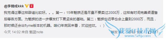 魅族科技副总裁李楠回应该传闻,称这是“传谣言”,并在微博中表示,第一:15年魅族还是尽量不要卖过2000万,这样有时间完善渠道售后等各方面。为魅族的进一步爆发打下更坚实的基础。第二:魅族也迟早也会上量到2000万,而且,那时候还会出flyme版本的机器。