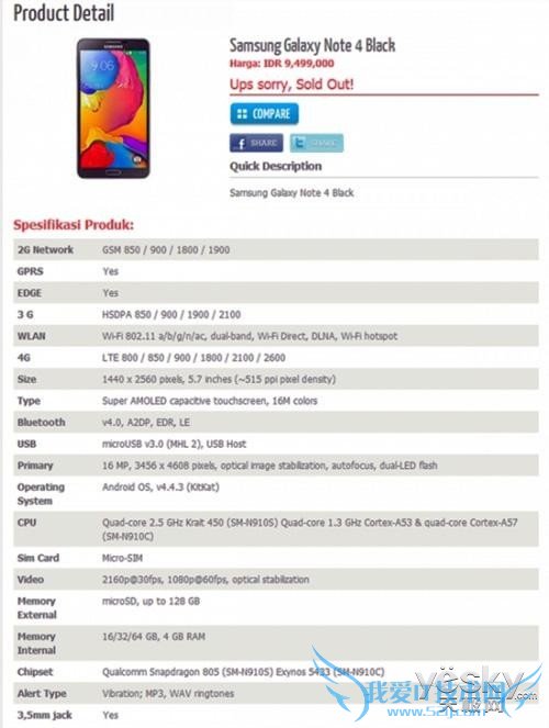 日前,外媒曝光了一张Note 4的销售网页截屏。从图上来看,Note 4采用了5.7英寸2560×1440分辨率屏幕,搭载四核2.5GHz高通骁龙805处理器或八核64位的Exynos 5433处理器,内置4GB RAM和16/32/64GB机身存储空间,最大支持128GB Micro SD卡扩展,提供一颗1600万像素摄像头(双LED闪光灯),数据接口为USB 3.0,运行Android 4.4.3操作系统,整体配置非常强悍。