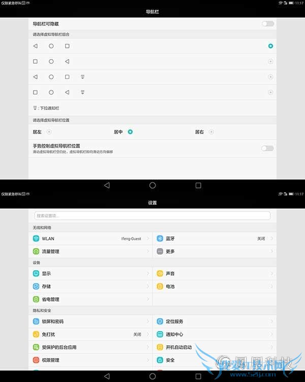 在一进入设置菜单时,我们就可以看到所有的功能选项都是两列分辨率在屏幕两侧,竖直持握时同样是两列,而且在菜单中我们可以看到华为揽阅M2 10.0的虚拟导航键是可以进行隐藏或者自定义设置的,这对于不喜欢虚拟导航键的朋友来说确实是一大福音。而且像是管家应用也变成了“平板管家”,其实在功能上并没有太多差异,不过显示上确实针对大屏幕进行了适配。