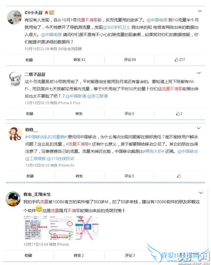 记者选取了几位比较有代表性的三大运营商的用户。微博名为“CV小天叔”的中国电信用户,吐槽“360手机卫士测出来的和电信官网给出来的数据出入很大”,对电信流量数据使用产生质疑;微博名为“二愣子叔叔”的中国联通用户,抱怨“9天用完了平时30天的量”;微博名为“稳稳_”和“客家_无限永生”的中国移动用户,则分称“乱扣流量,房子都要赔给移动公司了”和“流量被10086软件偷了500多M,扣了50多元钱”。