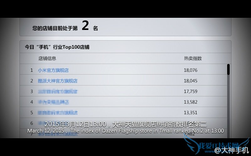 3月31日消息,今日大神官方微博曝光了一张关于天猫商城手机行业TOP100的店铺排行榜图片,图片中显示大神手机(酷派大神官方旗舰店)的热卖指数仅次于小米,排位第二。业内人士分析认为,经过一年的成长,在某种程度上大神手机已经成功挤进电商TOP3,“大小荣”的电商手机格局或已初步稳定。