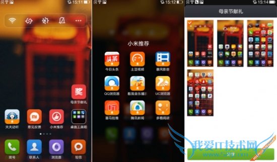 小米桌面,明显可看出附加了小米推荐、米聊等多个附加应用和广告推荐