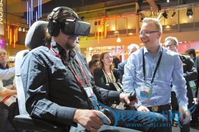 MWC(世界移动通信大会)正在西班牙巴塞罗那举行,一名男子在会展现场体验3D模拟器。图/东方IC