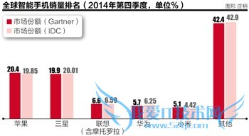 这种趋势到目前还在持续。市场调查机构Gartner在今年3月3日公布的调查数据显示,2014年第四季度,苹果iPhone共售出7483.2万台,超过了三星的7303.2万台;市场份额上,苹果为20.4%,三星为19.9%。而在上一年同期,三星的市场份额为29.5%,比苹果的17.8%多出了11.7%。