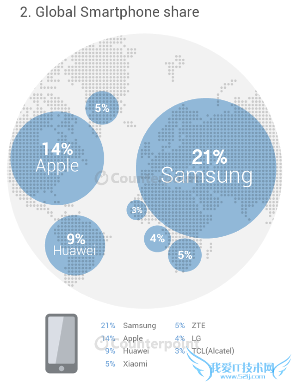 而在只有智能手机的出货量排行榜上,前三名仍然为三星、苹果、华为,而小米和中兴并列第四。