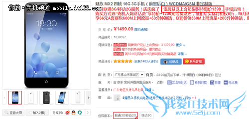 【IT168 什么值得买】魅族MX2凭借Flyme系统的优秀体验和不错的机身性能,获得很多消费者的认可。现在京东以1499元的售价促销MX2 16GB联通版本机型,在京东购机如果是银牌会员即可获得100元优惠(即购机价为1399元)再原装充电器;而官方商城售价则是1599元,赠送EP21耳机。