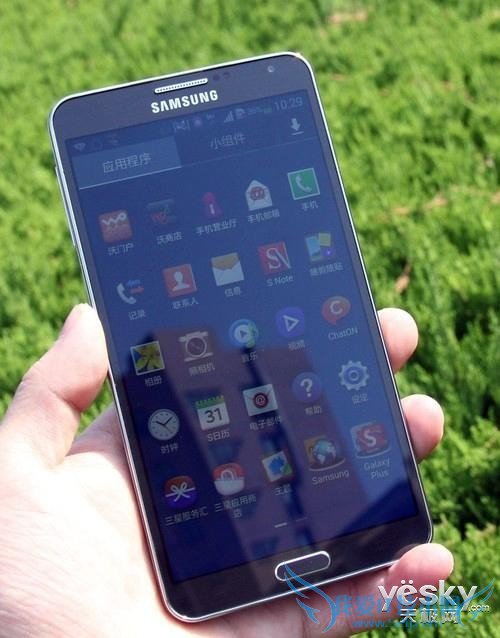 与前代作品一样,GALAXY Note 3屏幕下方有一颗标志性的实体Home键,按起来手感和键程适中,反馈力度非常明显,不会有那种按不实的感觉。Home键左右两侧分别是菜单键和返回键,在不触碰的情况下,它们都处于“隐藏”状态,保证了屏幕下方面板的一体感。