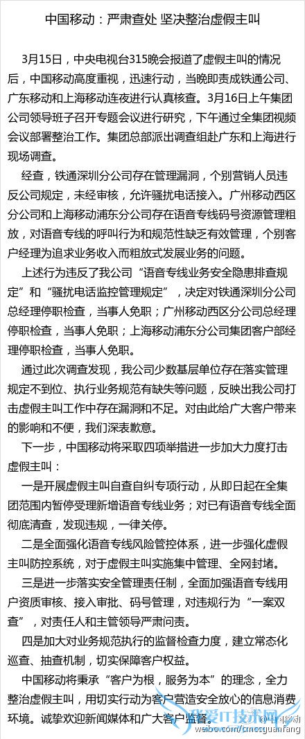 以上就是关于中移动回应315晚会事件:当事人免职 大力打击虚假主叫的手机资讯分享,更多手机知识请移步到>>手机知识。