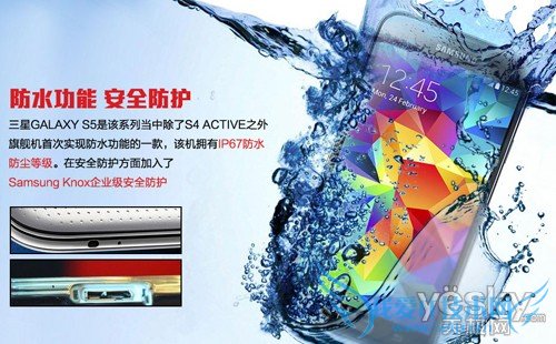 三星GALAXY S5采用了骁龙801的MSM8974AC四核处理器,主频高达2.5GHz,Adreno 330 GPU,内置2GB RAM+16/32GB ROM的存储空间组合。值得一提的是三星GALAXY S5是该系列当中除了S4 Active之外旗舰机首次实现防水功能的一款,该机拥有IP67防水防尘等级。在安全防护方面加入了Samsung Knox企业级安全防护。