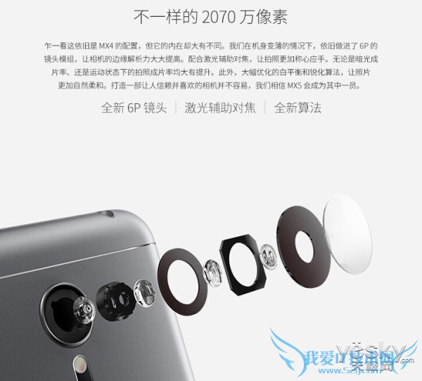 魅族MX5沿用专业的索尼2070万像素顶级CMOS,并将定制的6P蓝膜镜头模组囊括其中,照片成像质量绝佳。主摄像头下采用业界首创「一体式激光辅助对焦双闪光灯」,不管明暗光照,都可实现精准合焦。500万像素、f2.0超大光圈前置摄像头,搭配全新升级的 FotoNation 2.0智能美颜算法,美肤调亮交由系统自动完成。