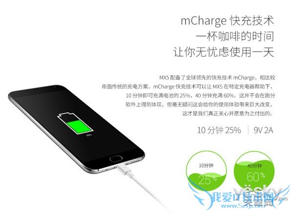 魅族MX5配备了一块5.5英寸1080P三星顶级的Super AMOLED屏幕展现了极为震撼的色彩表现张力。阳光屏、暗光屏的引入,可根据光线强弱进行实时调整,画面更加逼近真实,文字更加锐利清晰。魅族MX5配备了全球领先的快充技术mCharge,在特定充电器帮助下,mCharge 快充技术可以让魅族MX5在10分钟内即可充满电池电量的25%,40分钟充满60%。