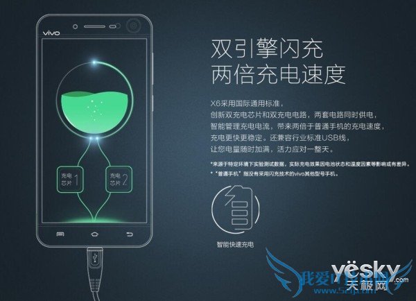 vivo X6Plus双4G版内置3000mAh电池,全网通远航版内置4000mAh电池,并采用由vivo自主研发的双引擎闪充基于国际通用标准,方案成熟,量产经验丰富,通过双充电芯片和双充电电路,将充电速度提升至普通手机的两倍。
