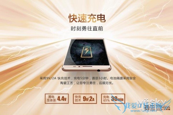 酷派锋尚MAX内置2800mAh容量电池,采用9V/2A快充技术,充电5分钟可通话3小时,充电30分钟电量可达65%。