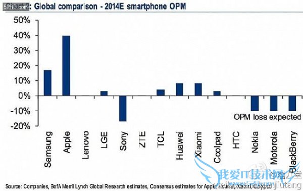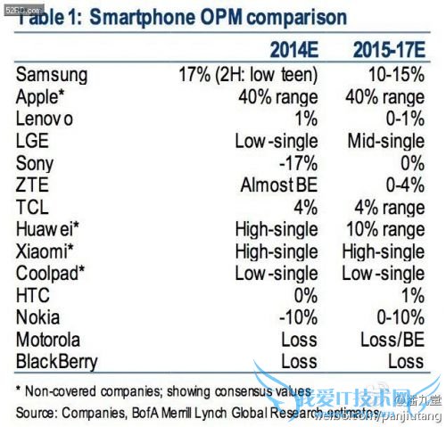 美林证券报告中,2014年苹果依然以40%的毛利率排第一名。预计2015~17年维持这个水平。三星今年毛利率只有17%,2015~17年将继续下滑到10~15%。索尼今年毛利率-17%,预计2015~17是0%。LG 毛利率是低位,2015~17预计是中游水平。诺基亚今年毛利率-10%,2015~17因为微软新东家,可以达到最高10%。摩托罗拉和黑莓继续亏损走势。