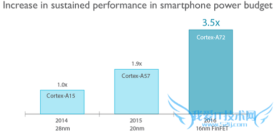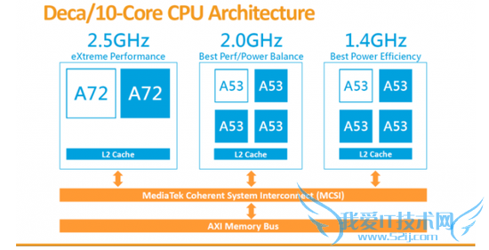 Helio X20采用了3个Cluster,包含了一个低功耗的1.4GHz四核心A53,一个平衡性能和功耗的2.0GHz四核心A53,以及一个用于高性能的2.5GHz的双核A72核心。根据ARM官方给出的数据,A72对比以前的A15性能提高了3.5倍,功耗却下降了75%,但是这一优化是在16nm FinFET工艺的加持下才获得的数据。所以实际采用20nm的Helio X20因为工艺的限制,并不能发挥出A72性能的上限。