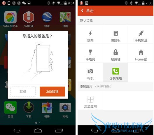360智键操作起来非常简单,在手机上下载360智键app,然后将智键插入手机耳机孔,在弹出的界面选择插入的设备为“360智键”。在单机或双击的功能设置里面找到伪装来电,选中它。