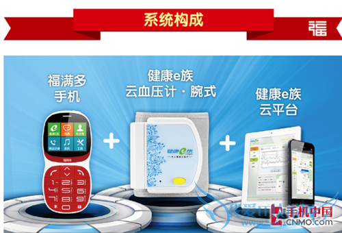 首先,给大家说明一下福满多的血压云监护系统最基础的三个元素,分别是:福满多手机,专用云血压计和健康e族云平台。前两者是实体设备,分别是老人用手机和配套的血压计。云平台则是整合数据的网络云端,福满多通过它将手机与血压计两者串联起来,成为一套完整的云端健康监测系统。这套系统的独到之处就在于,父母通过云血压计测量的数据,除了会在血压计的屏幕上显示出来之外,还会进一步上传到云端。福满多的健康e族云平台由此收录、整理和分析父母的身体指标,并及时通过福满多配套的手机进行反馈,让子女可以第一时间得知父母的血压发生的特殊情况。