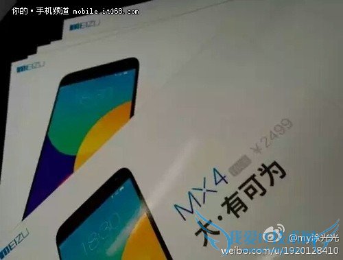 【IT168 资讯】魅族MX4的发布会即将召开,目前有关该机的更多信息也被透露出来。据网友反馈,目前在微博上有用户放出了疑似MX4的官方宣传图片以及真机谍照,甚至连价格都随着曝光出来,不过略微遗憾的是宣传图的清晰度不佳,部分细节无法看清,真实性还有待进一步确定。