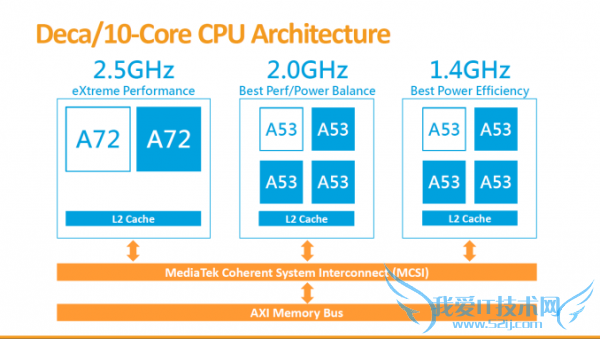对于多核的调度,联发科也有自家的本领。以Helio X20,它是一款十核心的处理器,十核被分为3个Cluster(簇),分别是四个低频A53+四个高频A53+两个A72的组合,如何能让这样的三簇处理器正常运行,令它们各自做适合自己的事情,把功耗做到最优的平衡,这需要一个好的调度系统。