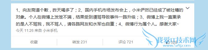 随后,@疯狂的杨林已经在微博上道歉,称是由于自己喝多了才出此言论,并称目前国内手机市场发布会上,小米俨然已经成了被吐槽的对象,因此才在微博上发泄不满。