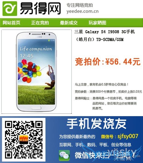 作为一款安卓机皇手机,三星GALAXY S4除了在安卓手机的硬件竞赛当中荣登榜首外,同时还在应用和软件优化方面也得到大幅的提升,支持双摄像头同时拍照、智能滚动功能,并且还搭载最新的Android 4.2.2操作系统,性能彪悍,耐用。目前该机在商家“易得网”【www.yeedee.com.cn】 进行天天特价秒杀活动,上一期的网友秒杀价仅为56.44元,感兴趣的朋友赶紧来看看,惊喜不断哦!