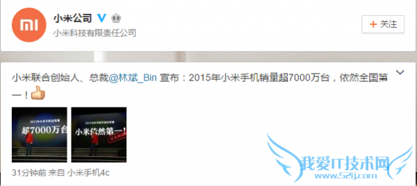 欢迎您访问52ij手机之家,今天小编为你分享的是手机资讯:小米公布15年总销量:超7000万台 全国第一,让你在第一时间了解手机的最新动态,下面是详细的分享!