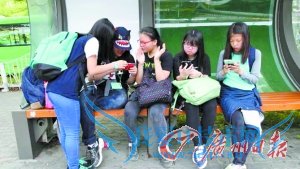 在首尔一个候车亭,放学的韩国学生都在玩自己的智能手机。