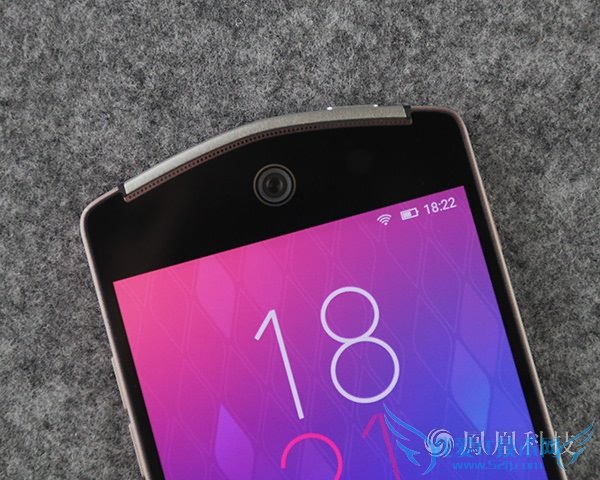 虽然美图手机V4大体上依然延续了双V字形设计,但是在细节方面,屏幕的上下两端都有一个银色的金属饰条,并且还都有一排开孔充当了听筒的角色,这让整机的前面板变得更加一体化,视觉效果好了不少。美图手机V4一贯的超大前置摄像头依然是非常显眼的,旁边还能看出有柔光灯,不亮时的“隐蔽工程”还是挺好的,起码息屏时正面的一体性还是挺高的。