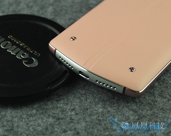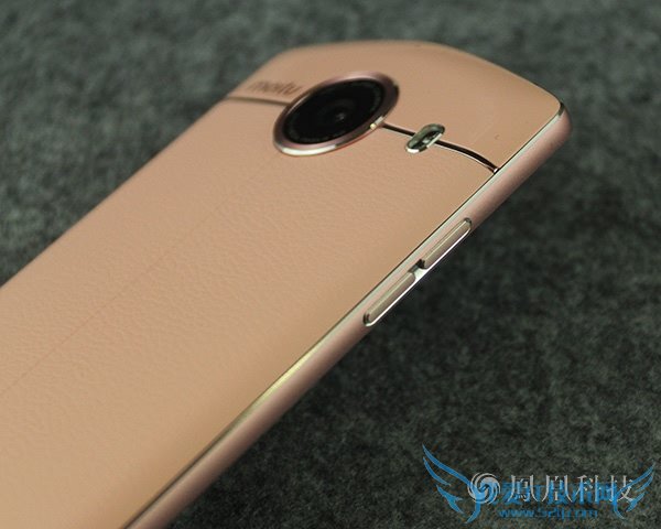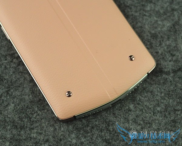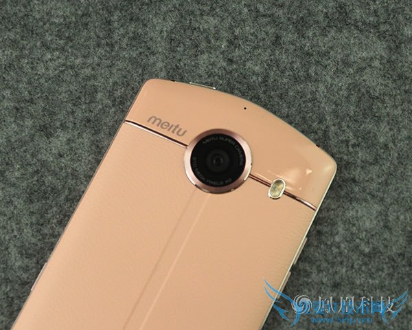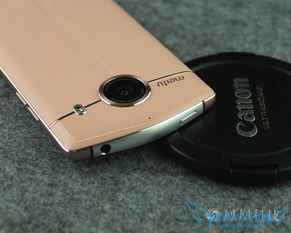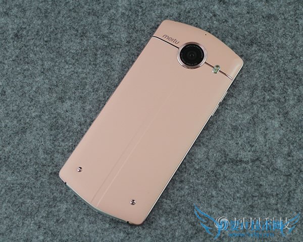 美图手机V4的机身背面较前作有着非常明显的变化,首先就是前文中提到的色彩,这种淡粉色应该是为了迎合金属中框以及背面的仿皮革背壳而特意选择的。该机摄像头上部的背壳采用了烤漆处理,而其余部分则采用了仿皮革处理,不过手感稍稍有些硬,这两部分中间还有一个镀铬饰条。美图手机V4背面很多细节上也变了不少,比如摄像头周围一圈采用了金属材质,美图手机的英文logo放在了摄像头左侧,并且尺寸小了不少。而且在机身背面的最底部还加入了铆钉的元素,配合上仿皮革处理的背壳,整机的时尚感营造的值得肯定。