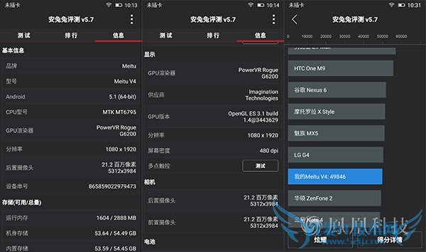 美图V4采用了联发科MT6795八核处理器,也就是Helio X10,主频为1.7Ghz,集成了PowerVR G6200图形处理器,在内存方面采用了3GB RAM+64GB ROM,相对于美图M4来说可以说这有着非常明显的提升,美图V4的安兔兔跑分成绩也达到了5万分。抛开分数不谈的话,美图V4标配64GB ROM还是比较给力的。