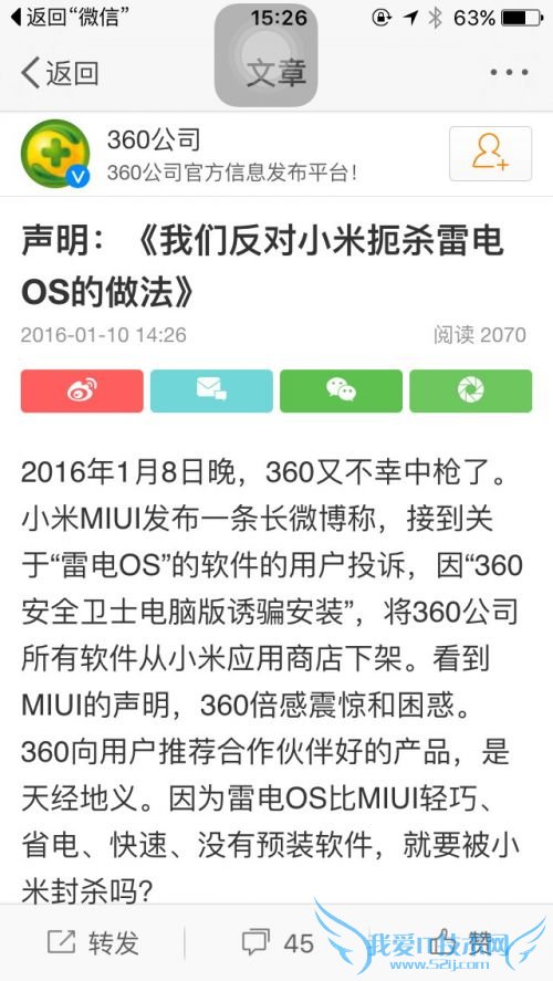 2016年1月8日晚,360又不幸中枪了。小米MIUI发布一条长微博称,接到关于“雷电OS”的软件的用户投诉,因“360安全卫士电脑版诱骗安装”,将360公司所有软件从小米应用商店下架。看到MIUI的声明,360倍感震惊和困惑。360向用户推荐合作伙伴好的产品,是天经地义。因为雷电OS比MIUI轻巧、省电、快速、没有预装软件,就要被小米封杀吗?