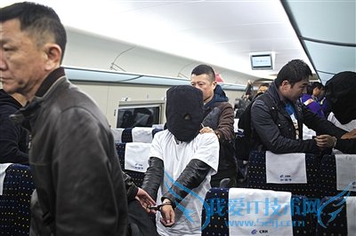 11月9日7时许,海淀警方的几十名民警,将18名嫌疑人押上从南宁开往北京的火车。为便于识别,还为嫌疑人准备了白色短袖T恤,T恤上写有负责民警的名字。车上,每两名民警负责看管一嫌疑人,坐在车厢后部。13个多小时后,列车驶入北京西站,嫌疑人头戴头套,被押下车。