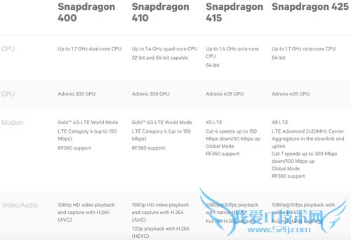 骁龙425将推出具有4G LTE Cat 7,内建高通RF360前端解决方案,支持全球5模频段。支持双SIM,LTE广播和VoLTE。