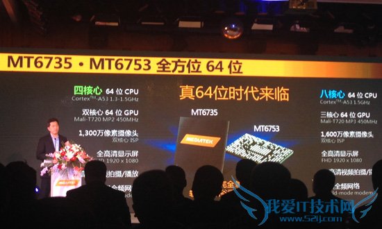 MT6735和MT6753分别搭载四颗和八颗64位ARM Cortex-A53处理器核心,GPU为Mali-T720图形处理器,支持1080p 30fps H.264视频播放和录制,内置了联发科MiraVision技术,能够提供数字电视级别的影响质量。