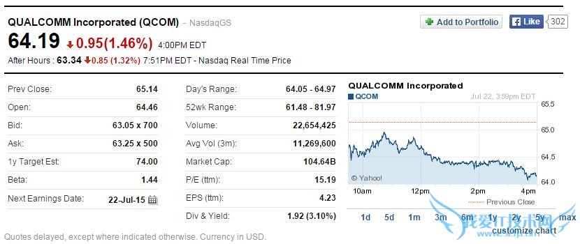 截至周三纳斯达克股市收盘,高通股价较上一交易日下跌0.95美元,收于64.19美元,跌幅为1.46%。高通盘后股价继续下跌。截至美东时间7月22日下午19:30(北京时间7月23早7:32),高通股价下跌1.24美元,跌幅为1.85%,暂报63美元。过去52周高通股价浮动范围:61.48美元-78.53美元。(编译/少年)