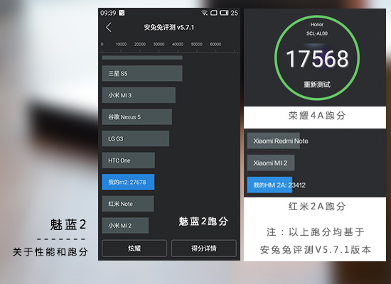 性能方面,应该也可以说是此次魅蓝2最放心的一个部分。对比红米2A联芯LC1860+1GBRAM和荣耀4A的骁龙210+2GB RAM。前者1GB RAM明显短板,后者是骁龙210性能着急,这一点我们可以直接参考安兔兔跑分。