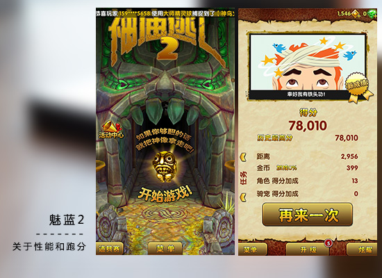 具体来说,魅蓝2采用MT6753 64位四核芯片,RAM部分提升为2GB。整体来看除了CPU数据和年末的一代持平,对于流畅性影响显著的RAM部分提升一倍。不过需要注意的是,此次魅蓝2采用Mali-T720 GPU,相比较一代T760 MP2来说性能略有缩减,但能耗比更高。实测方面,我们选用了入门级3D游戏神庙逃亡进行测试。实测游戏载入17秒,表现尚可。在游戏进行中,跑到3000米距离依旧没有出现掉帧卡顿,所以日常游戏应该没什么压力。