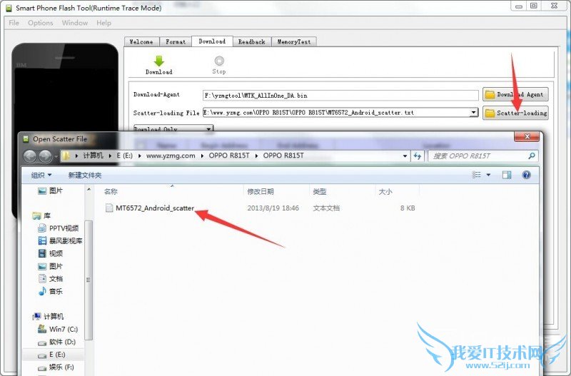 打开下载的刷机工具,选择“Scatter-loading”,再选择线刷包里的MT文件,如图