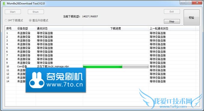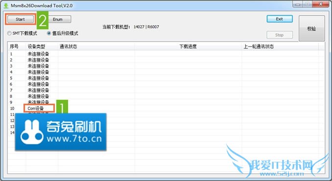 打开后手机关机状态下,按住 音量上 并插入 数据线,等待工具出现 com设备,出现后点击 Start 开始刷机:注意:com设备的序号是随机的,不需要按照截图,识别出来即可刷机(以下截图为OPPO R6007截图,步骤类似)