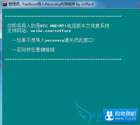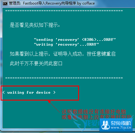 4.然后按照提示操作就可以,HTC 802d(One电信版)刷入recovery完成之后会有提示,如果出现下面红框里的提示了,说明数据线没有连接好电脑,或着是电脑上没有安装好驱动造成的。