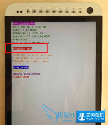 1.HTC 802d(One电信版)手机要进入fastboot模式,进入的方法:先彻底的关闭手机,然后按住手机的音量下键 + 电源键开机(两键一起按不要松),过一会就进入HBOOT模式,然后再按一下电源键即可进入fastboot,然后用数据线连接电脑,如果连接正确的话此时就会显示fastboot usb,如下图: