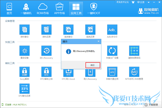 等待刷入Recovery文件,奇兔Recovery刷入成功后,点击“确定”