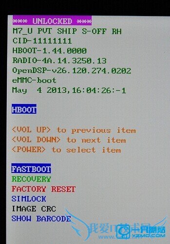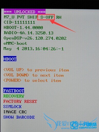 2.看看手机是否已经S-OFF(关机状态,长按音量键减少键,再按电源键进入HBOOT,查看第一行结尾是不是S-OFF)