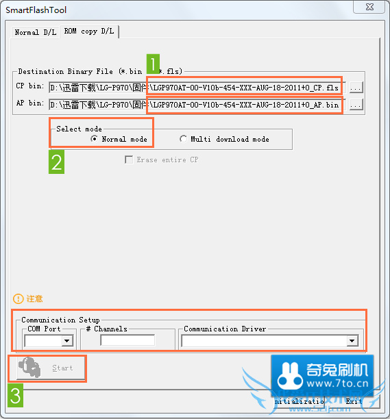 选择工具包“固件”文件夹内的刷机包,第一个框是fls文件,第二个框是bin文件,千万不要选错,按照下图顺序走,最后点start;