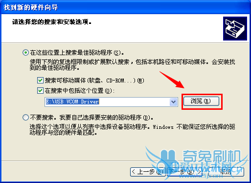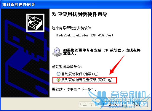这时候电脑会弹出让你安装驱动的界面如下图。选择【从列表或者指定的位置安装】,然后点击【下一步】。如果没有弹出,用鼠标右键点击【我的电脑】,然后选择【管理】,点击【设备管理器】,右键黄色的【MT65xx Preloader】(没有的话请换个USB口连接) , 选择【更新驱动程序】。然后出现下图。
