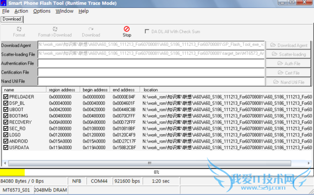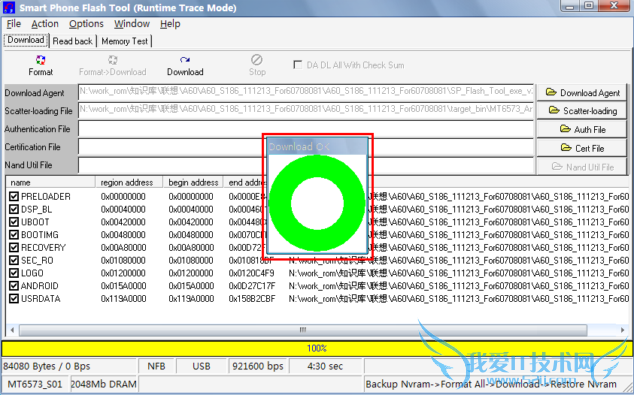 3.打开线刷工具进行到找到MT6572_Android_scatter.txt文本时,目录转到target_bin里就可以找到,然后勾上说明书里面的选项,等进度条加载完了过后数据线连接电脑和手机,插上电池,就开始线刷了线刷完后的截图: