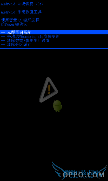 2.同时按住音量减小键与电源键约10s,手机将开启直到进入recovery mode。